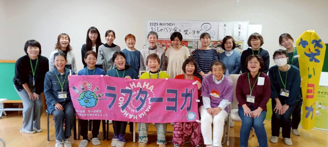 そして前回好評だった笑いヨガを、前回と同じ講師の先生をお招きし行いました。初めて体験される方もおられましたが、先生方の心に響くお話と笑いとともに体もぽかぽか、心もほかほか、気分爽快となりました。「自分を褒める」とっても大切です。「笑う門には健康来たる」で、健康寿命を延ばす第一歩として、「笑いヨガ」で1日15分間程度笑ってみましょう。